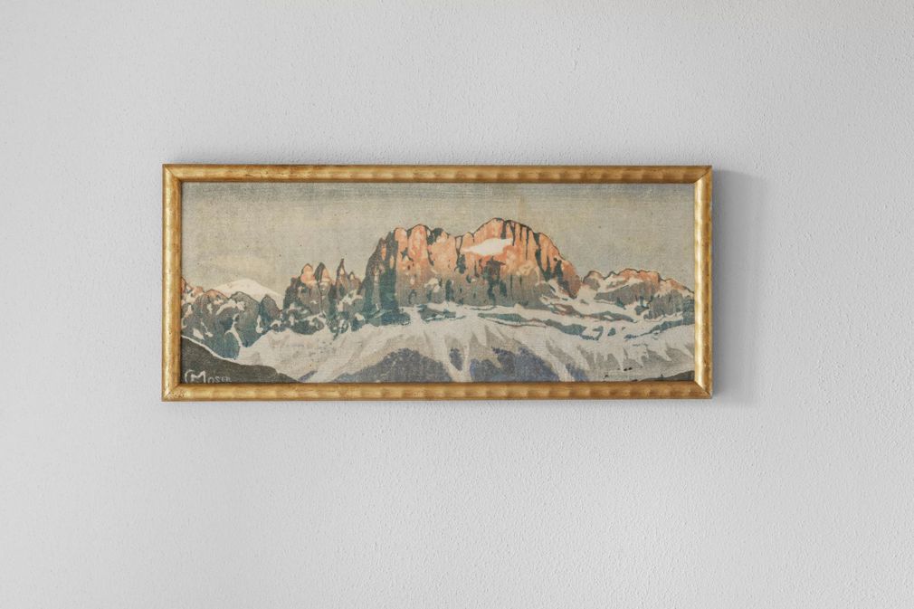Der renommierte Südtiroler Maler Carl Moser (Bozen, 1873–1939) erlangte vor allem durch seine Farbholzschnitte Bekanntheit. Wie nur wenige europäische Künstler seiner Zeit war er imstande, in dieser Technik eine prägnante Synthese aus europäischen und japanischen Einflüssen einzugehen. Als Hauptmotiv wählte er meist Landschaften und Menschen des Alpenraums. Im Holzschnitt „Rosengarten“, der im ICARO hängt, feiert er die Farbintensität der Dolomiten.